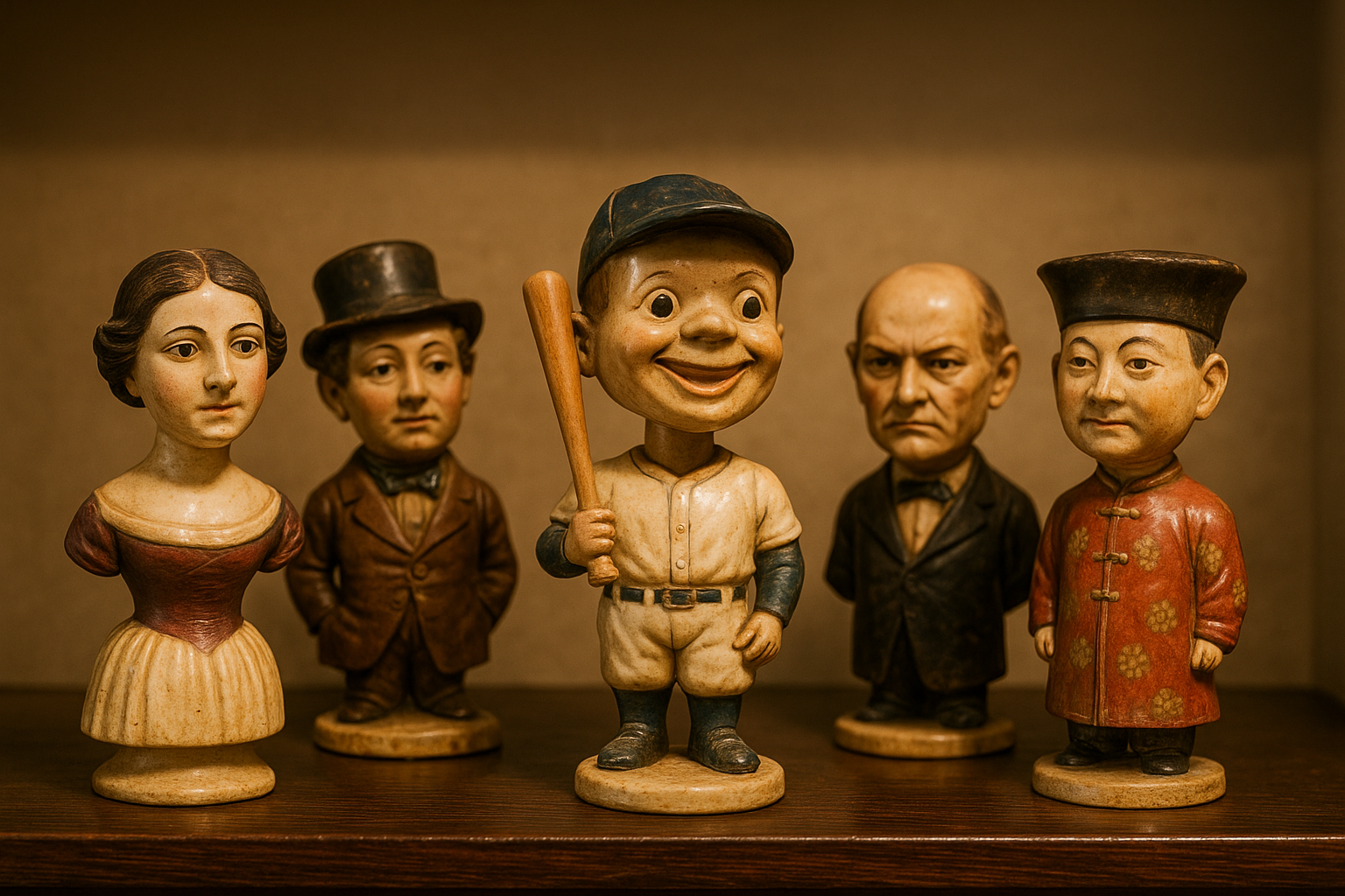 Early ceramic “nodding dolls” from 19th-century Europe are considered the first generation of bobblehead-style figures.